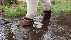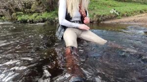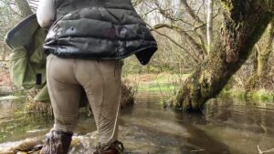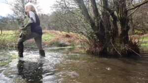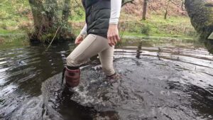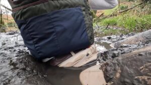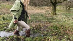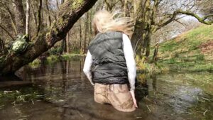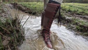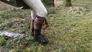 The boots were waterproof to ankle height, thanks to an integral gusset and a waterproof and breathable membrane that lined the foot parts, but when the water reached mid-calf it began seeping through the zips at the backs of the boots. The gradual wetting of her socks spurred her on as she climbed the rolling hills to a secluded area which is always wet and muddy.