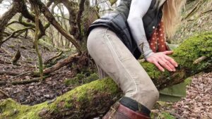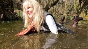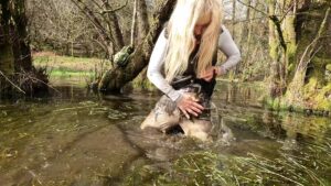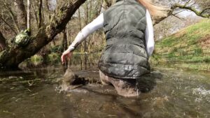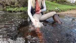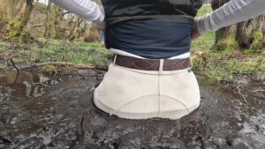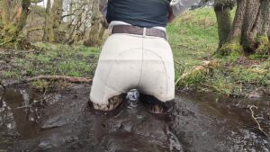 Throwing her rigging coat over a tree, she strode along the muddy stream that ran from the temporary pond, with mud over her knees she dropped slowly to a kneeling position and then sat back. This was clearly beyond the point of no return and so she enjoyed the mud to the full.