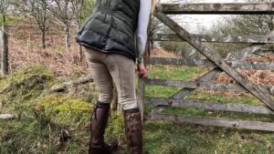 In addition to her new riding boots she was wearing a pair of lycra riding tights, an Ariat competition shirt, a Joules gilet and a long waterproof Rooster rigging coat.