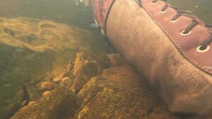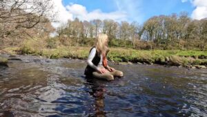 On the way back to the truck she detoured via the river, sitting on a large rock which was submerged in the water whilst she cleaned-up as best she could. Reclining briefly with the water up to her arm pits she declared that her new boots were now properly broken-in, and with that she put on her warm coat, zipped it up and headed satisfied back to the car.