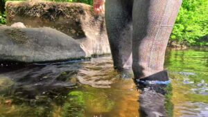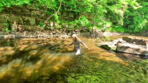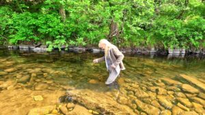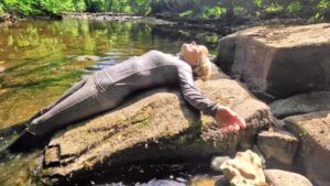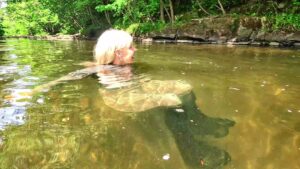 Wading deeper and deeper she enjoyed the experience immensely. She removed her jacket so that she’d have something dry to drive home in, and slowly submerged herself in the river. She splashed and swam and floated. It was cool and exhilarating and she felt immersed in nature as well as the river.