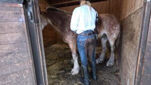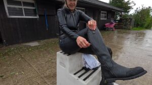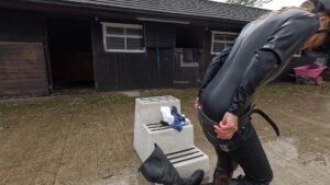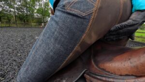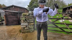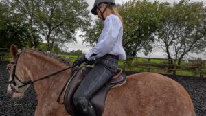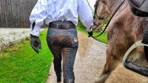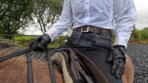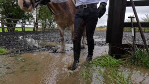 But it wasn’t particularly cold, so no need for major wet weather gear. A pair of medium weight HKM denim jodhpurs with a brown suede seat, a white blouse and a lightweight Ariat waterproof jacket. A pair of Bareback waterproof leather riding boots completed the outfit.
