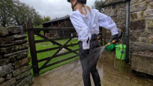 “Why do I always get dirty when I play with horses?” she thought, as she headed to the hosepipe. There was no point trying to minimise the spray, she was already soaked, so she simply rinsed herself off all over.