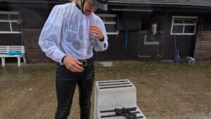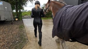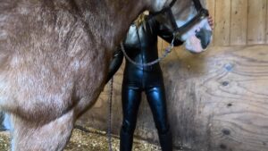 It was only when she walked back to the mounting block and began to unbutton her shirt that the real reason for feeling so hot whilst riding became clear. The latex catsuit underneath her riding clothes! Trust Andrea to prepare well for riding in the rain…