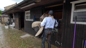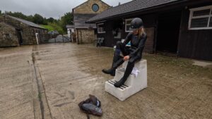 After 20 minutes of canter, counter-canter and flying changes, she was very soggy but also very hot so she took of the jacket and let the rain soak into her shirt. Splashing back through the puddles she patted her horse and showed her into her stable.