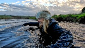 Nevertheless, “in for a penny, in for a pound”, as they say. And so, she waded arm-pit deep across flooded fields, and jumped into neck deep water in flooded ditches. It really was great fun, and such a liberating experience at the same time. But she got very cold in the process.