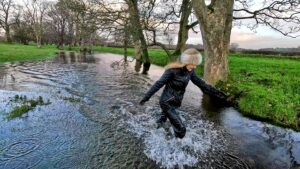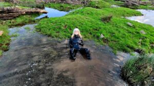 Nevertheless, “in for a penny, in for a pound”, as they say. And so, she waded arm-pit deep across flooded fields, and jumped into neck deep water in flooded ditches. It really was great fun, and such a liberating experience at the same time. But she got very cold in the process.