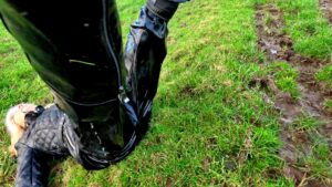 It was a lovely, clear, crisp Winter’s day, following what had been 2 weeks of very wet weather. Everywhere was flooded and Andrea wanted to see how high local river had been during the peak of the flooding. She chose to wear a pair of loose-fitting, real leather, very high-waisted trousers with leather knee-high boots and a leather biker jacket. Ideal clothes for getting very wet in!